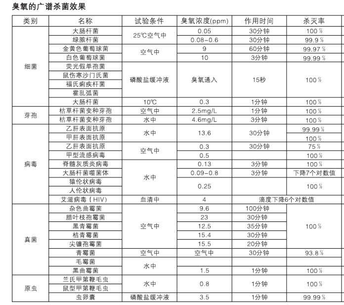 臭氧具有極強的氧化性的特點,被世界公認(rèn)是一種廣譜高效殺菌劑,它的氧化能力高于氯一倍,滅菌比氯快600-3000倍,甚至幾秒鐘內(nèi)可以殺死細菌,對于常見的大腸桿菌、糞鏈球菌、綠膿桿菌、金黃葡萄球菌、霉菌等,在臭氧的環(huán)境中5分鐘,其殺滅率可達到99%以上。