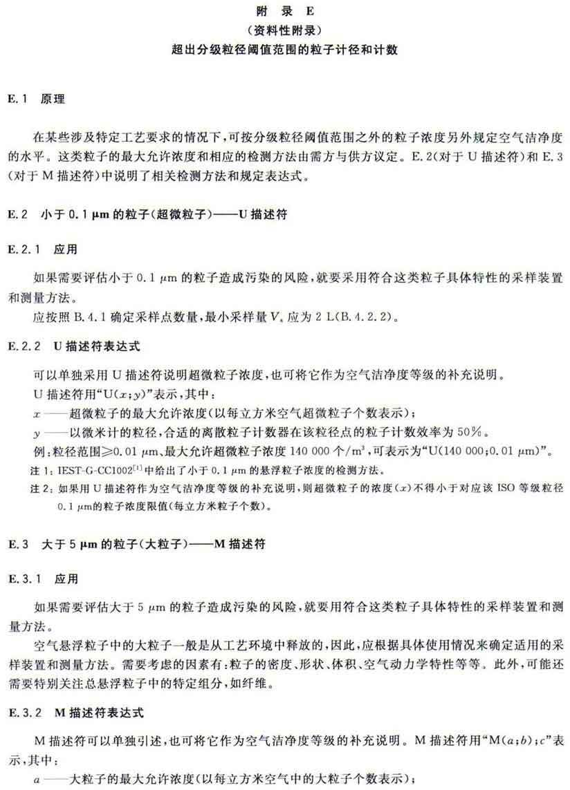 GB/T25915的本部分劃分潔凈室及相關(guān)受控環(huán)境的空氣潔凈度等級僅依據(jù)其內(nèi)的空氣懸浮粒子濃度,該濃度系指粒徑大于或扥估閾值(低限)粒徑為0.1μm~5μm規(guī)定粒徑以外粒子總數(shù)的潔凈度等級。但可以用U描述符合M描述符,分別表述超微粒子(<0.1μm)和大粒子(>5μm)的總數(shù)。