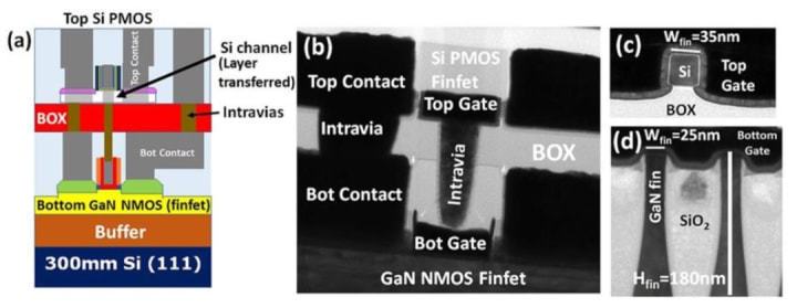 如何進(jìn)行晶體管的堆疊呢?大致兩種方法,第一種就是在晶圓上通過(guò)特殊工藝將晶體管直接做成多層的;另外一種就是和傳統(tǒng)工藝相同的方法在晶圓上制作一層晶體管,然后將多個(gè)晶圓堆疊起來(lái),晶圓之間通過(guò)TSV連接。關(guān)于第一種方法,目前有很多研究,例如將NMOS堆疊在PMOS上,從而節(jié)省一半的面積,使晶體管密度提升一倍。其難點(diǎn)在于上層的晶體管沒(méi)有致密的硅基底作為支撐,很難制作出高質(zhì)量的晶體管,另外,目前的技術(shù)也只能支持兩層堆疊。