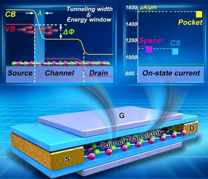 隧道場(chǎng)效應(yīng)晶體管(TFET-Tunnel Field Effect Transistor),和傳統(tǒng)MOSFET晶體管原理不同,在TFET中源極和漏極摻雜不同。它使用量子力學(xué)隧道效應(yīng),柵極和源極之間的電壓決定了電荷載流子是否可以“隧穿”通過(guò)源極和漏極之間的能量勢(shì)壘,以及電流是否可能流動(dòng)。