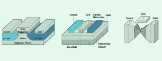 由于量子力學(xué)隧道效應(yīng),電子可以穿越絕緣體,這將使元件功能失效。人們開始尋找一種新型晶體管,可以進(jìn)一步提高未來(lái)集成電路的性能,作為傳統(tǒng)晶體管的替代品。目前有很多研究,但還沒(méi)有領(lǐng)先者可以取代硅MOSFET。研究人員列出了一系列MOSFET替代品,包括隧道場(chǎng)效應(yīng)晶體管TFET,碳納米管場(chǎng)效應(yīng)晶體管,單原子晶體管。